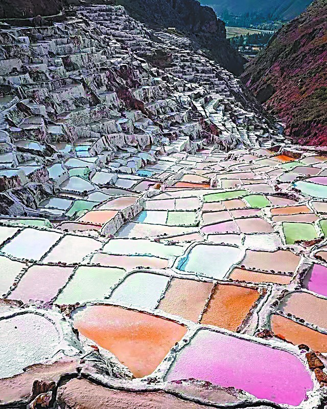 馬拉斯鹽田令人嘆為觀止。在安第斯山脈的峽谷之間,成千上萬塊大大小小形狀各異的小梯田在陡峭的山坡上層層排開。由于鹽田里注水,所以每一塊小格子都是一面“天空之境”,上萬面不規則的馬賽克鏡面矩陣,將四周的青山、高原、明媚的天空和陽光收納其中,此番景象仿佛是經過藝術家之手創作出來的藝術品,以獨特的方式呈現出秘魯高原之美。