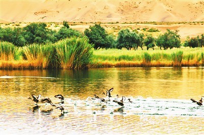 鳥類在巴丹吉林沙漠的海子里嬉戲。