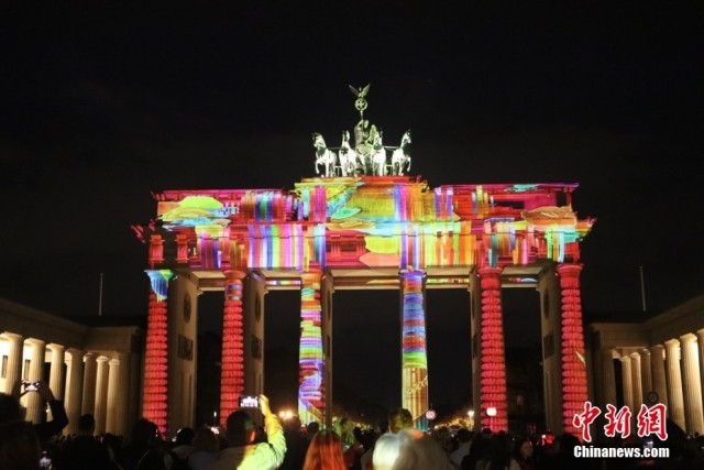 當地時間10月8日,被“點亮” 的勃蘭登堡門。2024柏林燈光節于10月4日至10月13日舉行。期間,柏林市內多個地標、建筑物等被燈光和裝置藝術品裝飾。