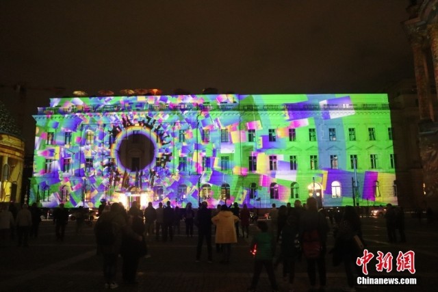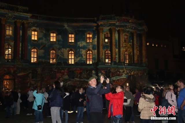 當地時間10月8日,游客在洪堡大學建筑前拍攝。2024柏林燈光節于10月4日至10月13日舉行。期間,柏林市內多個地標、建筑物等被燈光和裝置藝術品裝飾。