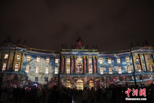 當地時間10月8日,被“點亮”的洪堡大學建筑。2024柏林燈光節于10月4日至10月13日舉行。期間,柏林市內多個地標、建筑物等被燈光和裝置藝術品裝飾。