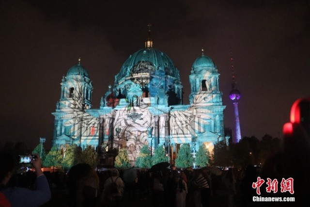 當地時間10月8日,被“點亮”的柏林大教堂。2024柏林燈光節于10月4日至10月13日舉行。期間,柏林市內多個地標、建筑物等被燈光和裝置藝術品裝飾。