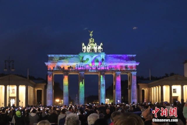 當地時間10月8日,被“點亮”的勃蘭登堡門。2024柏林燈光節于10月4日至10月13日舉行。期間,柏林市內多個地標、建筑物等被燈光和裝置藝術品裝飾。