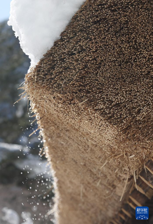 這是2月25日在日本岐阜縣白川鄉的“合掌造”民家園博物館拍攝的“合掌造”房屋的屋頂一角。
