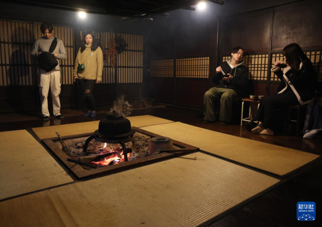 2月25日,在日本岐阜縣白川鄉的“合掌造”民家園博物館,游客在“合掌造”房屋內體驗當地傳統生活文化。
