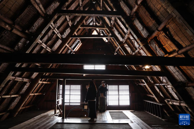 2月25日,在日本岐阜縣白川鄉的“合掌造”民家園博物館,游客在“合掌造”房屋內部留影。