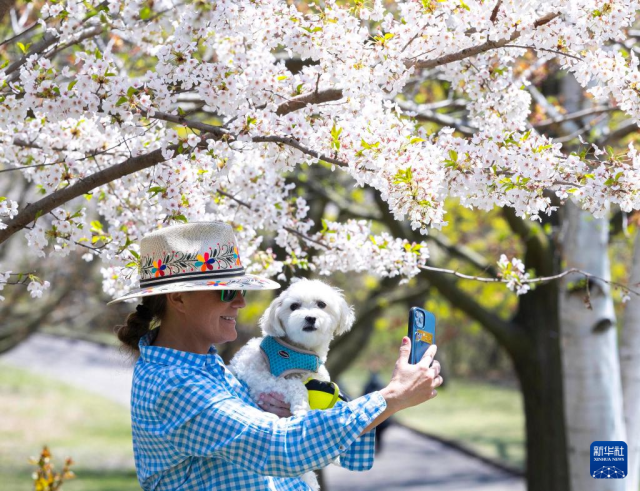 5月6日,一名女子在加拿大多倫多一處公園的櫻花樹下與寵物狗自拍。