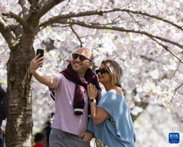 5月6日,人們在加拿大多倫多一處公園的櫻花樹下自拍。