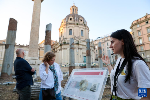 7月5日傍晚,在意大利羅馬,講解員在古羅馬廣場為游客講解。