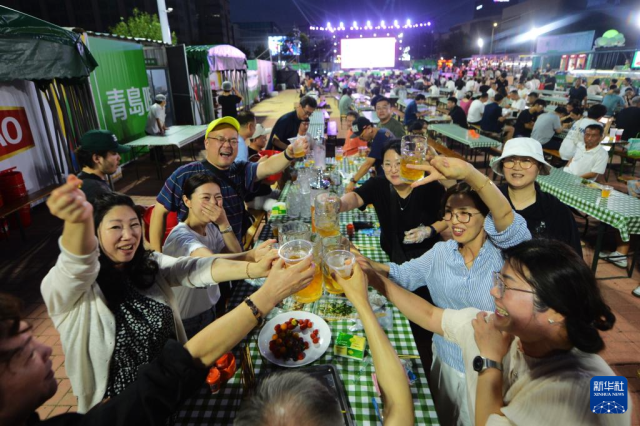 7月20日,在第35屆青島國際啤酒節嶗山會場,游客享受啤酒節夏夜狂歡。