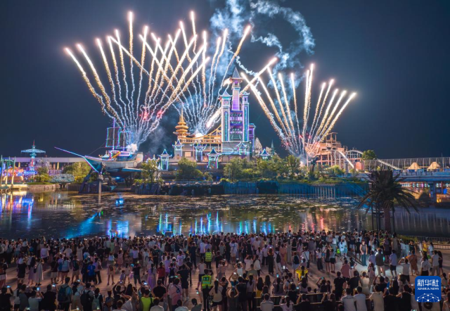 7月19日,在湖北省襄陽市華僑城奇幻谷,游客觀看大型夜間演藝秀《奇幻城堡光影秀》(無人機照片)。