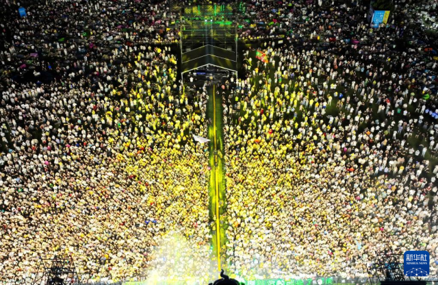 7月19日,在山東省東營市東營文匯河海音樂節,樂迷觀看演出(無人機照片)。