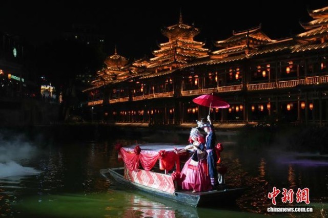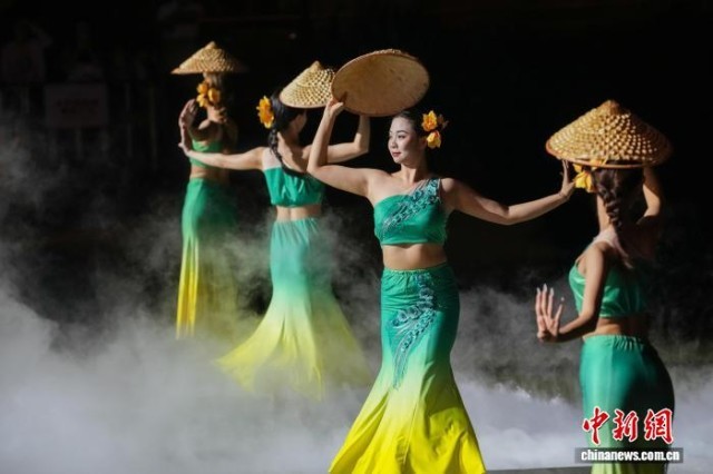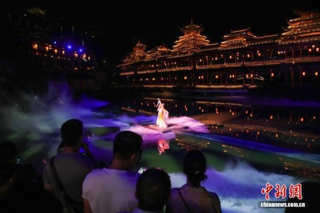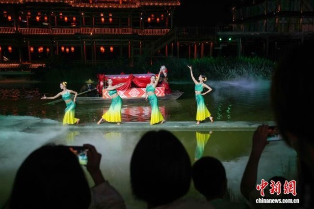 7月24日晚,廣西南寧民歌湖國際音樂小鎮內湖區,民族風情濃郁的表演吸引不少游人駐足。中新社記者 陳冠言 攝