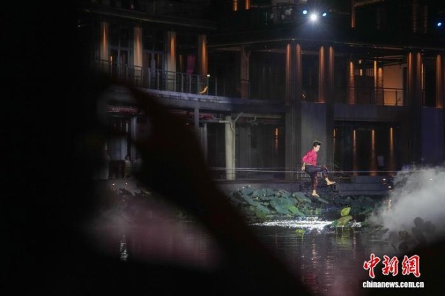 圖為《水漾新娘》表演中,演員向觀眾拋繡球。中新社記者 陳冠言 攝