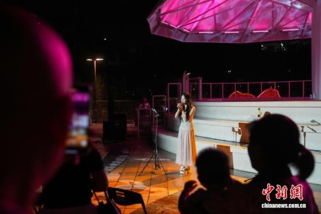 7月24日晚,廣西南寧民歌湖國際音樂小鎮莫離塔區域,歌手上演露天演唱會吸引不少游人駐足。中新社記者 陳冠言 攝