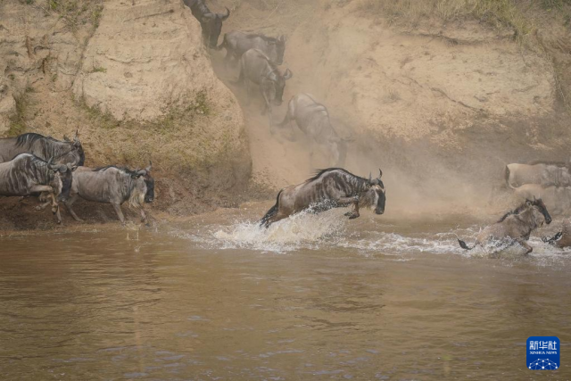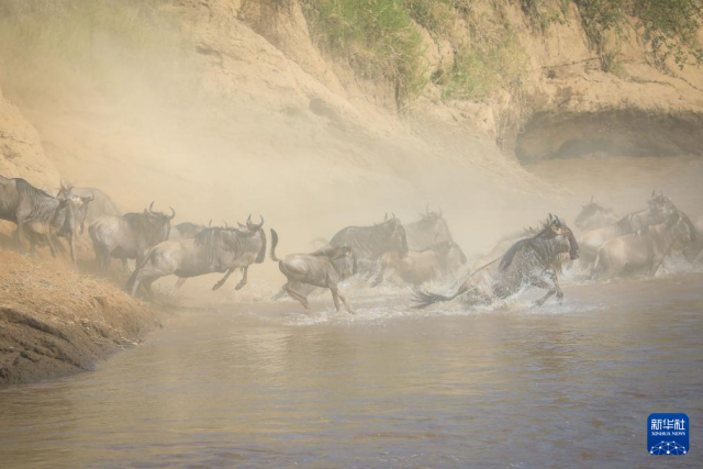 7月30日,在肯尼亞馬賽馬拉國家保護區,角馬奔向馬拉河準備渡河。