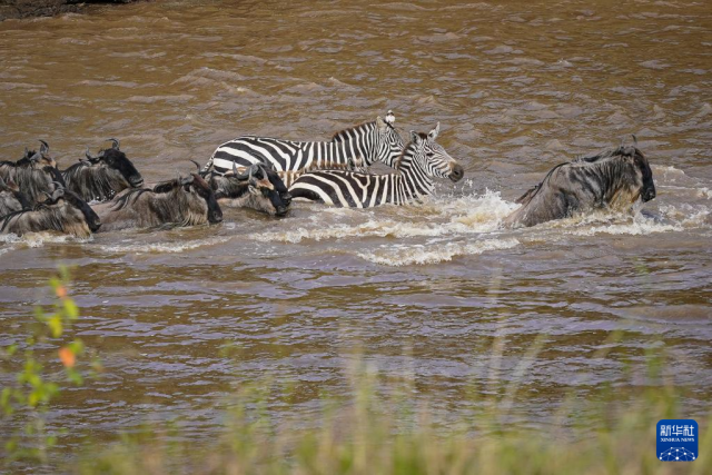 7月30日,在肯尼亞馬賽馬拉國家保護區,角馬和斑馬渡過馬拉河。