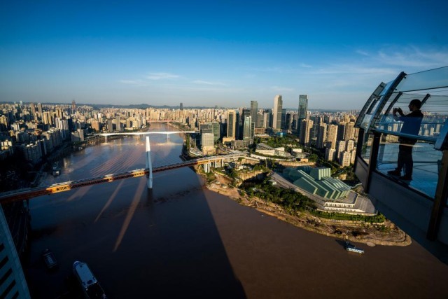 在重慶來福士探索艙·云端樂園觀景平臺上,一名男子在拍攝城市景色。新華社記者劉潺 攝