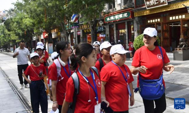 8月3日,來自新疆喀什和夏阿瓦提鎮的中小學生在北京前門大街參觀研學。