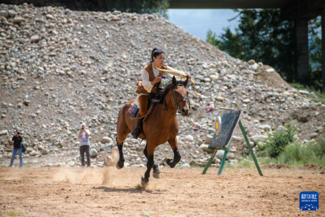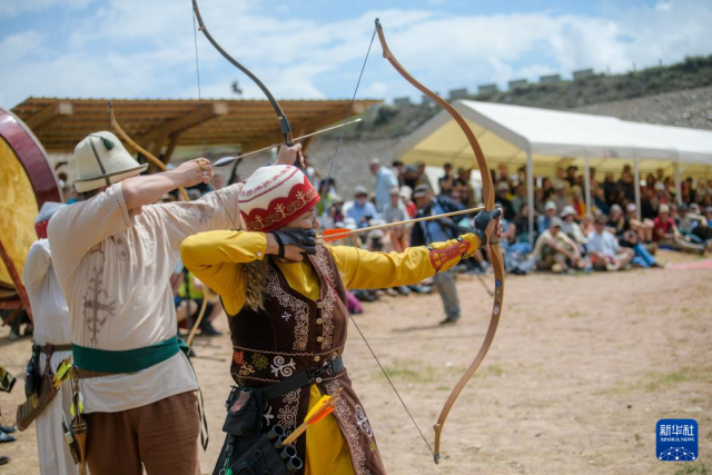 這是8月2日在吉爾吉斯斯坦伊塞克湖南岸舉行的民俗藝術節上拍攝的射箭表演。