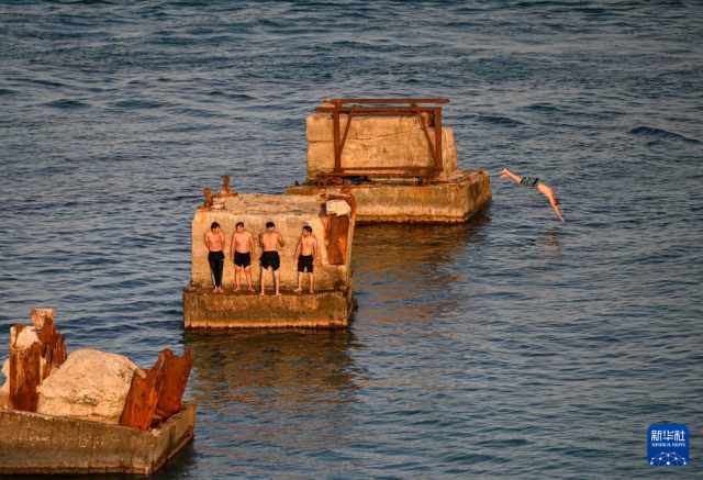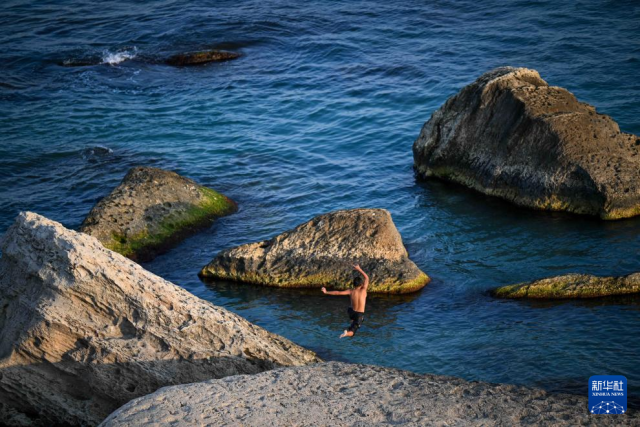 8月5日,在哈薩克斯坦阿克套,一個男孩在里海海邊縱身跳向大海。
