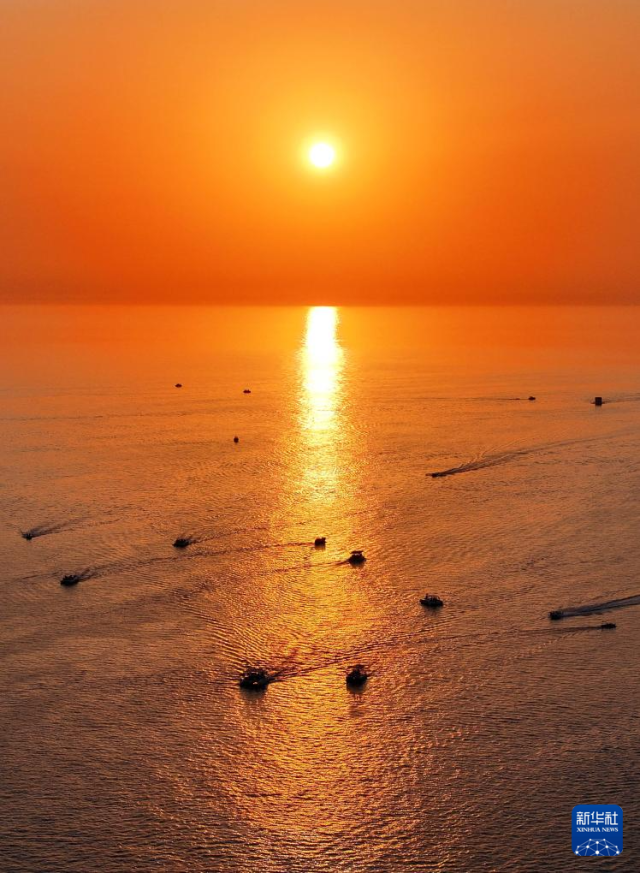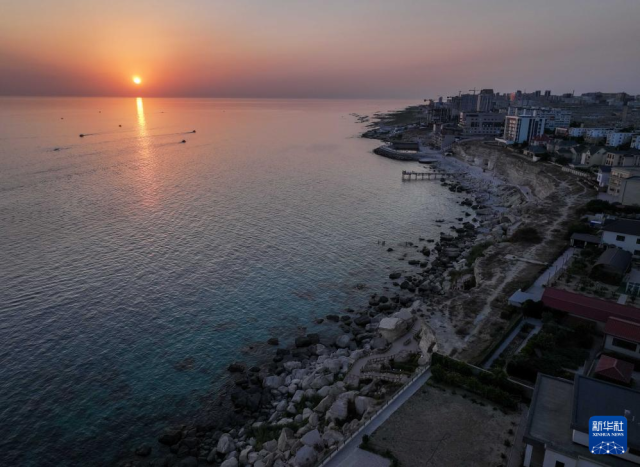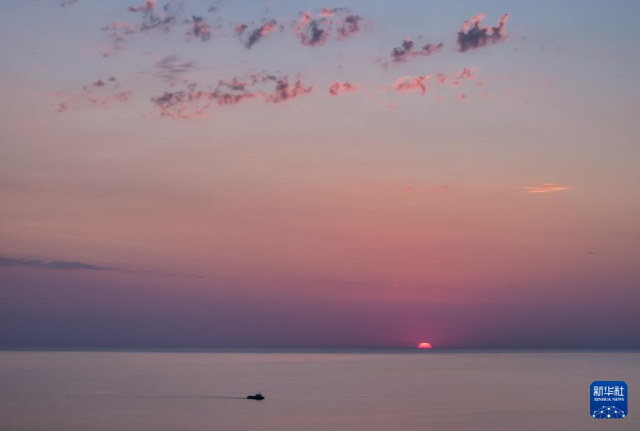 這是8月5日在哈薩克斯坦阿克套拍攝的日落景象(無人機照片)。