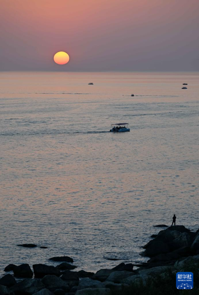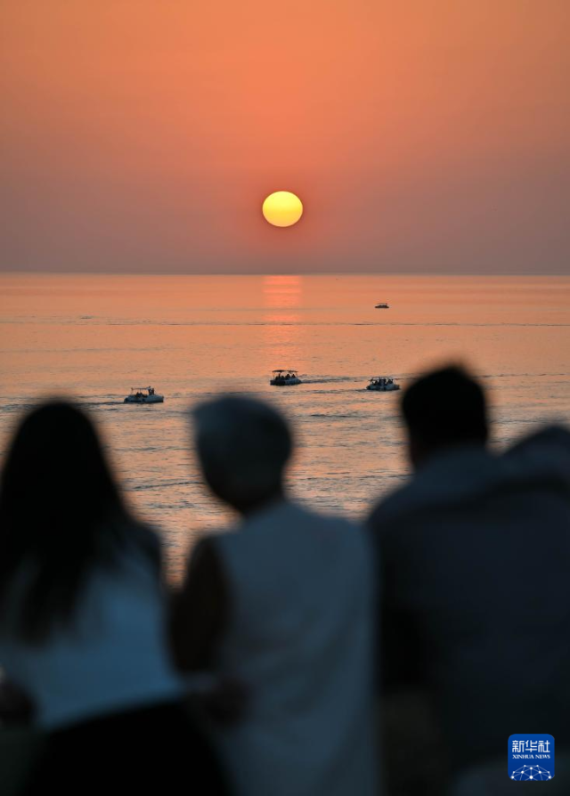 8月5日,在哈薩克斯坦阿克套,人們在里海海邊欣賞日落。