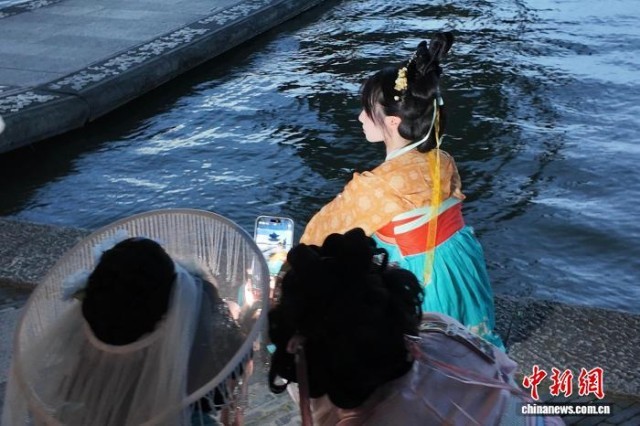 8月6日,游客身穿傳統服飾在西湖邊留影。當日,浙江杭州,傍晚的西湖景色美如畫,吸引游客打卡。中新社記者 錢晨菲 攝