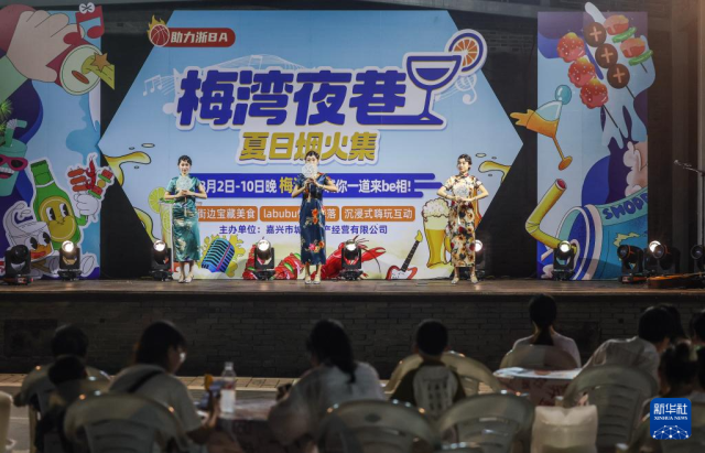 這是8月7日在嘉興市南湖區梅灣街西區拍攝的“梅灣夜巷·夏日煙火集”表演。