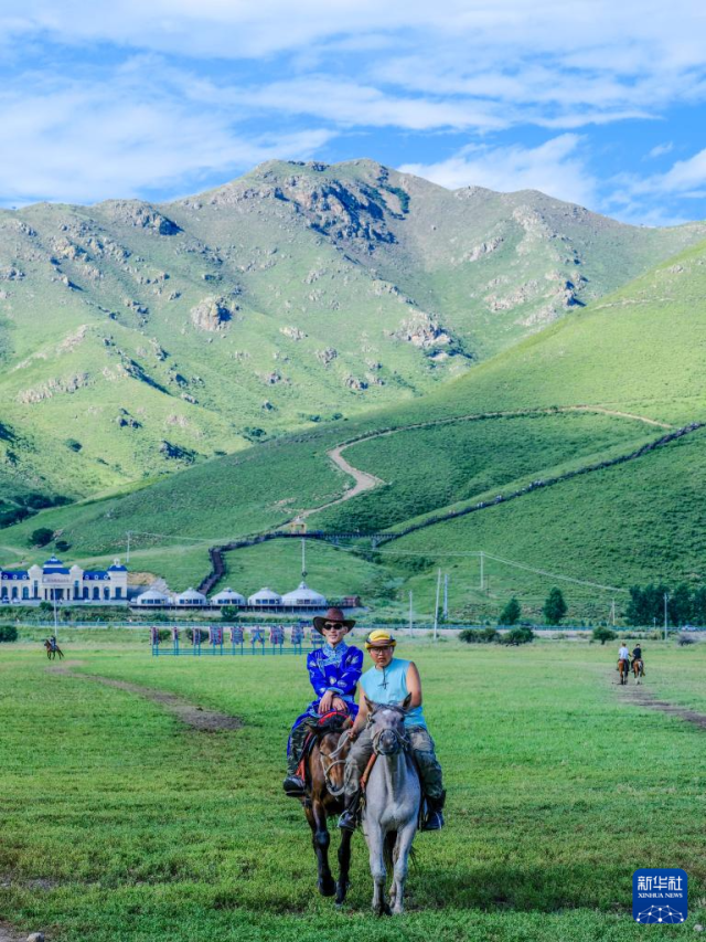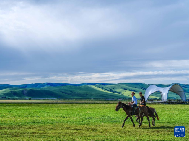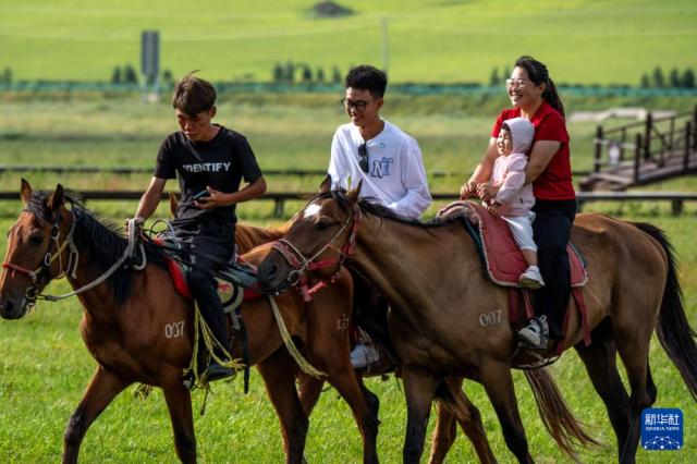 8月9日,游客在內蒙古興安盟科爾沁右翼前旗烏蘭毛都草原上騎馬休閑。