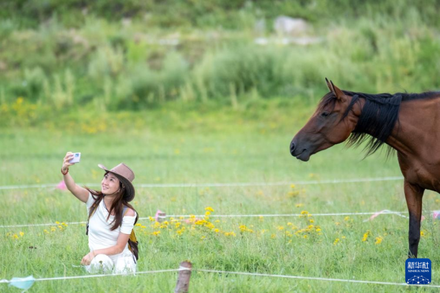 8月9日,游客在內蒙古興安盟科爾沁右翼前旗烏蘭毛都草原上和馬合影。