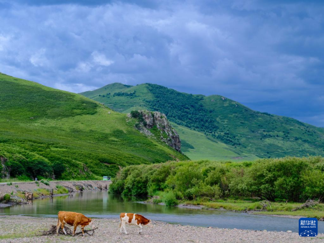 8月9日,在內蒙古興安盟科爾沁右翼前旗烏蘭毛都草原的烏蘭河畔拍攝的牛。