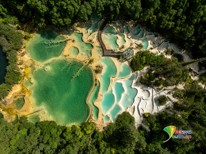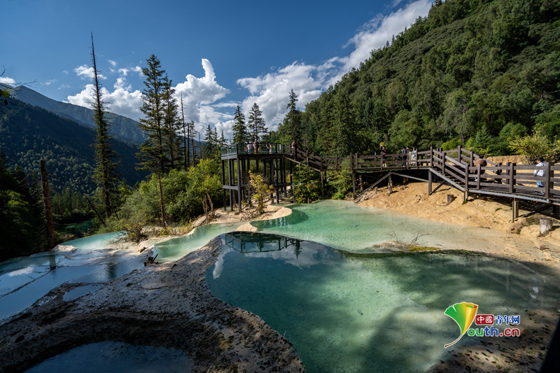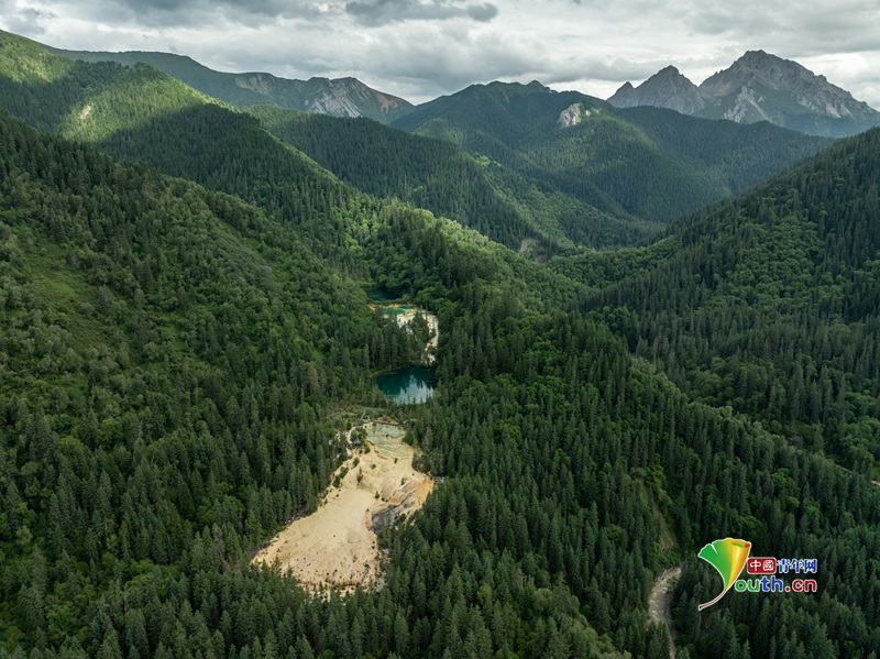 四川阿壩州:九寨溝神仙池綠意綿延 碧水蕩漾