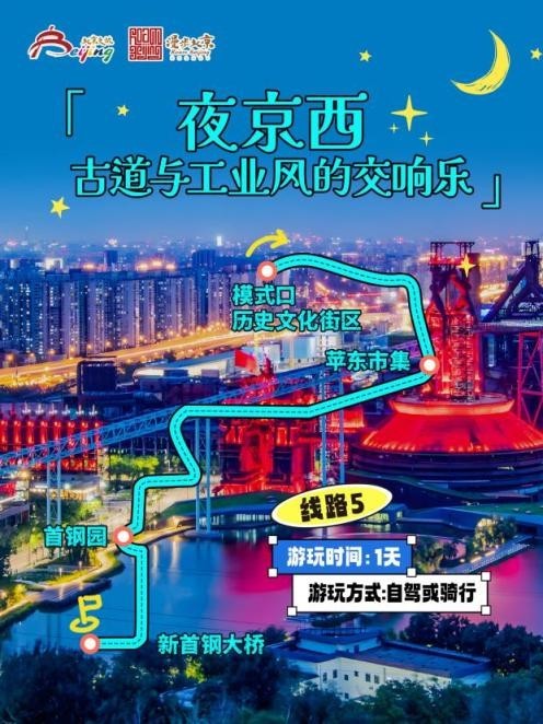 線路特色:走進模式口歷史文化街區,來一場跨越時空的文化漫游,打卡法海寺、承恩寺等景點,周五、周六在模式口公園對月高歌;暮色將至,在蘋東市集的煙火氣氛圍中,暢享夏日夜晚的酣暢淋漓;探索硬核工業風的首鋼園,看工業遺存與科技體驗的酷炫空間,周末還可以觀看流行音樂演出;夜色降臨,去新首鋼大橋來一場沉浸式騎行。