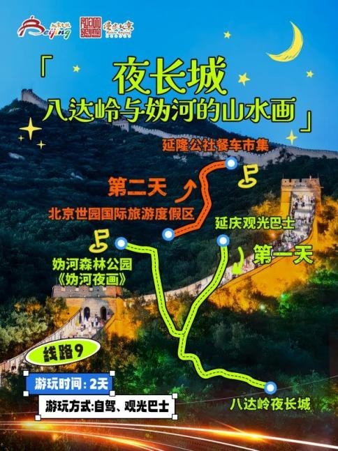 線路特色:延慶高鐵站出發,乘坐延慶觀光巴士,今夏最IN的夜生活方式登陸延慶!英國倫敦同款雙層觀光巴士華麗變身,一層備餐,頂層藏著18個VIP觀景座,360°全景天窗邂逅璀璨星空,空調車廂里冰啤管夠!再夜爬八達嶺長城,觀看精彩絕倫的沉浸式主題演出,開啟一場跨時空對話;沿著媯河河岸漫步,欣賞一場沉浸式民族風情生態實景演出;白天在北京世園國際旅游度假區群山環繞的天然空調房里,寵物友好、親子陪伴、戶外消暑,夜間體驗光影藝術、無人機秀、煙火市集、高空熱氣球等N種浪漫體驗,邀你共赴一場精彩的夏夜之約;最后在延隆公社餐車市集品嘗美食、觀看精彩演出,感受星夜的激情與活力。