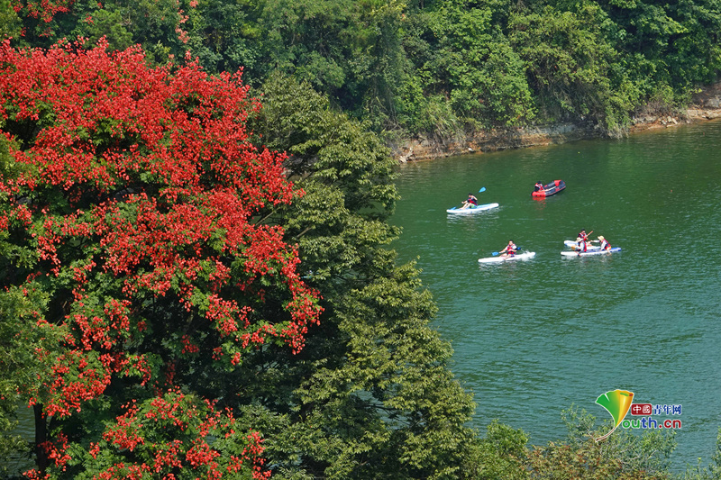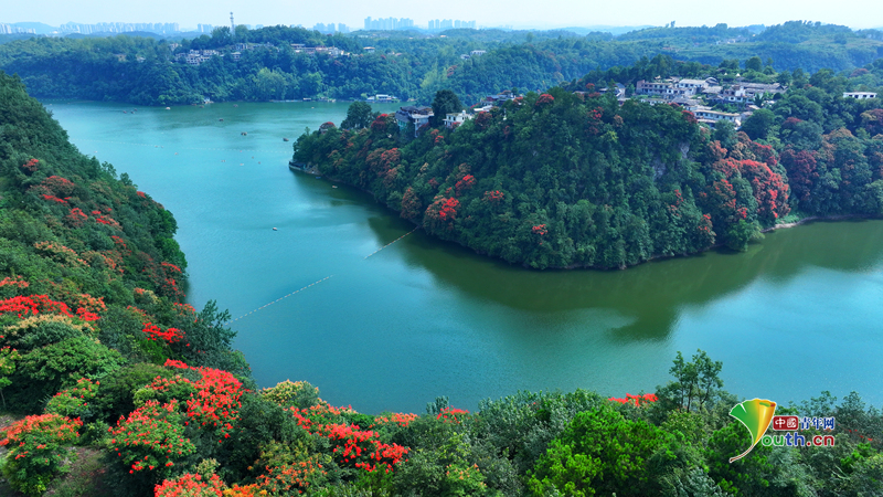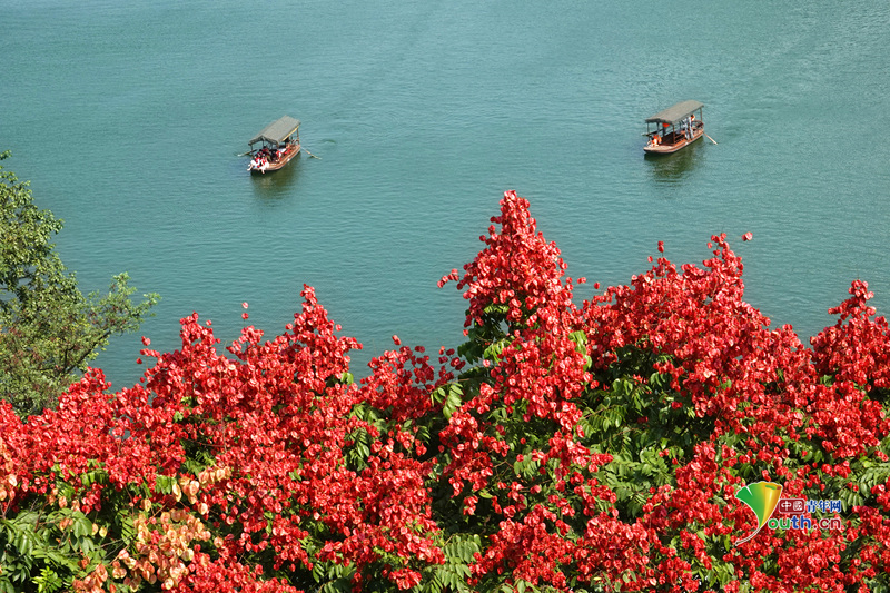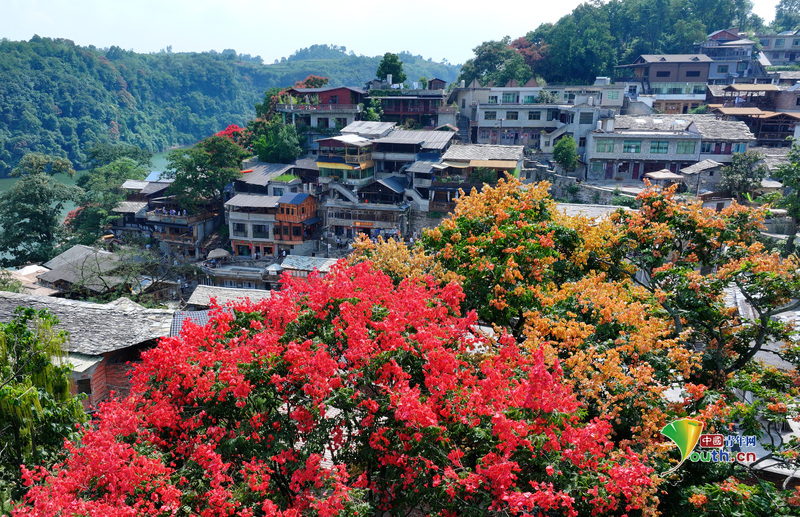 8月14日,初秋時節,欒樹進入最佳觀賞期,貴州省貴陽市花溪區石板鎮鎮山布依族村,三面環水的半島式山寨,在欒樹紅色秋實的環繞下秋意盎然,宛如秋日里的一幅油畫,分外俏麗惹眼,令人賞心悅目,美不勝收,吸引眾多游客前來觀賞。鎮山布依族村寨先后獲評中國傳統村落、中國少數民族特色村寨等稱號,并通過生態博物館模式實現對民族文化的活態保護,2019年1月,鎮山村入選第七批中國歷史文化名村。