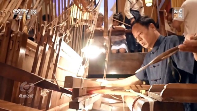 蜀錦省級非遺傳承人 曹代武:梭子從這個開口里邊過來,然后我就把緯線編織到里面了,織出來就是你現在看到的這個唐代的五彩鳥紋樣。再來一梭,一梭一梭的,就這樣反反復復。