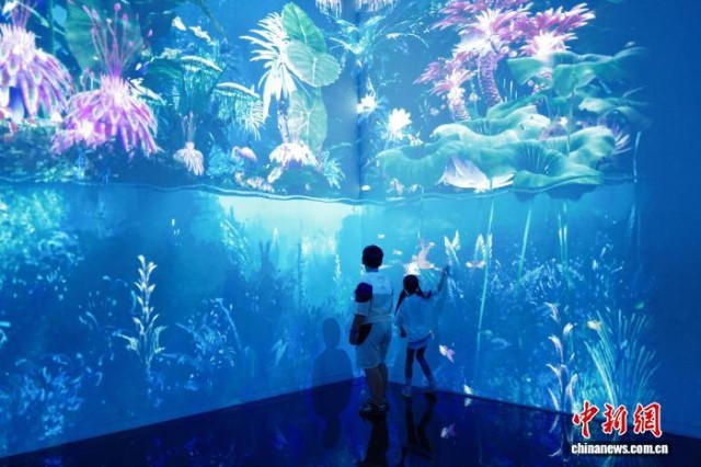 8月21日,小朋友在投影中感受海底世界的絢爛。暑期進入尾聲,位于杭州西溪濕地的中國濕地博物館人氣不減,多個展廳的豐富內容呈現出生物多樣性的魅力,游客在此感受人與自然和諧共生之美。中新社記者 張煜歡 攝