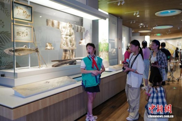 8月21日,志愿者小朋友為游客進行講解。暑期進入尾聲,位于杭州西溪濕地的中國濕地博物館人氣不減,多個展廳的豐富內容呈現出生物多樣性的魅力,游客在此感受人與自然和諧共生之美。中新社記者 張煜歡 攝