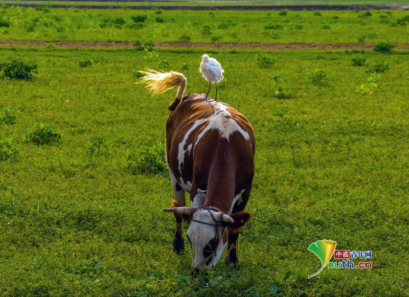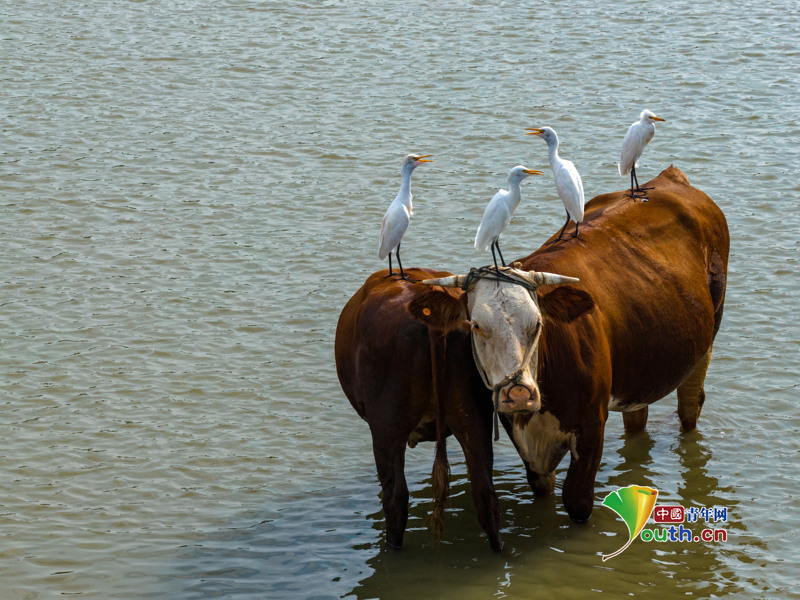 8月23日,江蘇省宿遷市沭陽縣境內的新沂河畔成群的白鷺輕盈地落在牛背上,等待覓食時機。