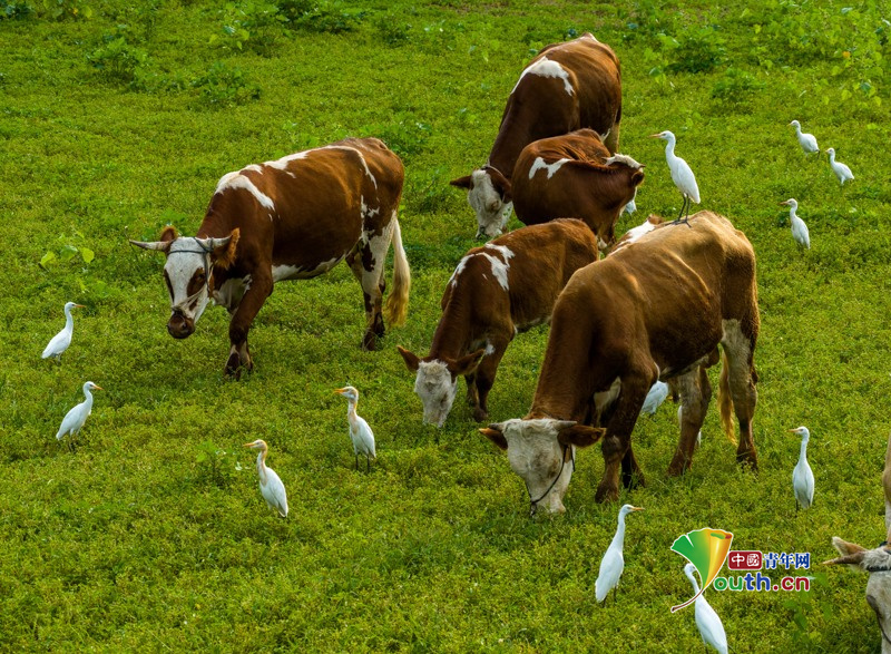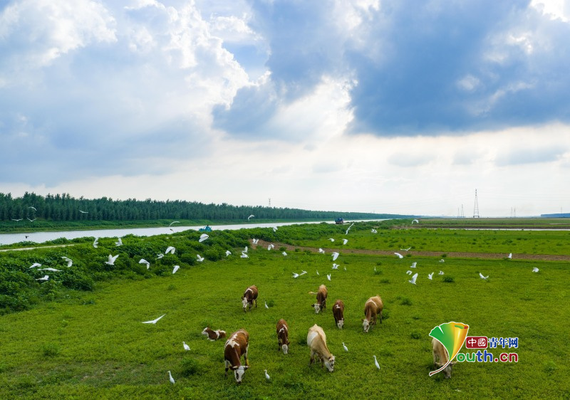 近年來,宿遷市沭陽縣持續推進生態環保工作,新沂河水質提升,生態環境改善,為牛、羊和鳥類提供了適宜的自然環境和覓食場所,大批的牛、羊在此放養,越來越多的鳥類選擇在此棲息,呈現出和諧的自然畫卷。