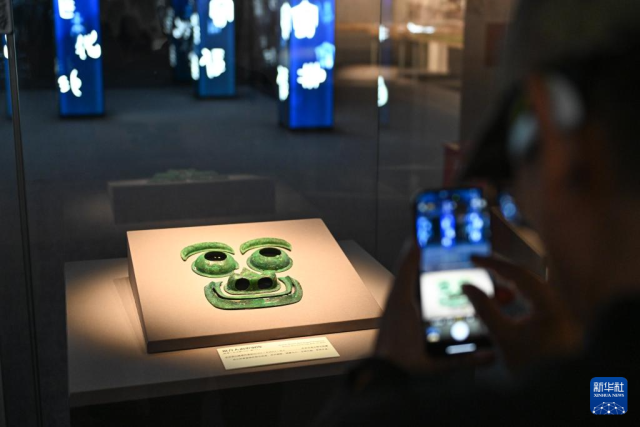 這是8月28日拍攝的展覽中的組合人面形銅飾。