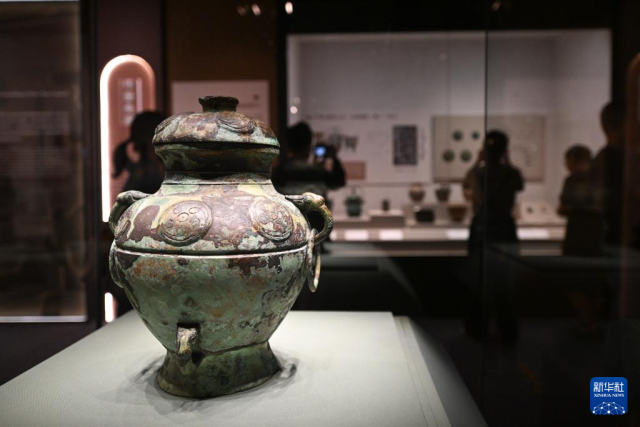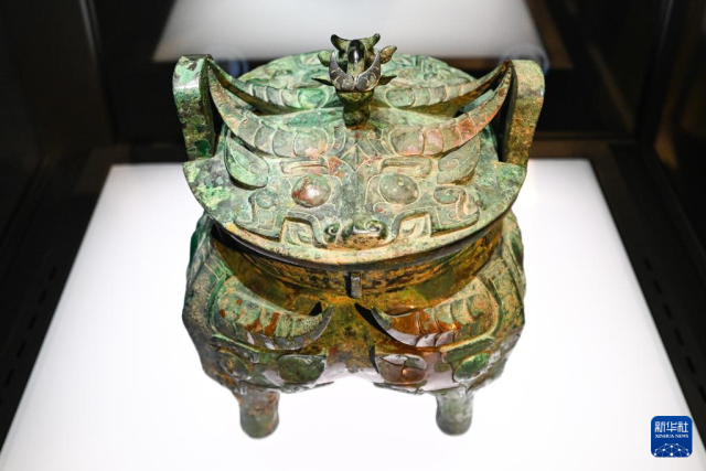 這是8月28日在展覽中拍攝的牛頭紋帶蓋伯矩鬲。