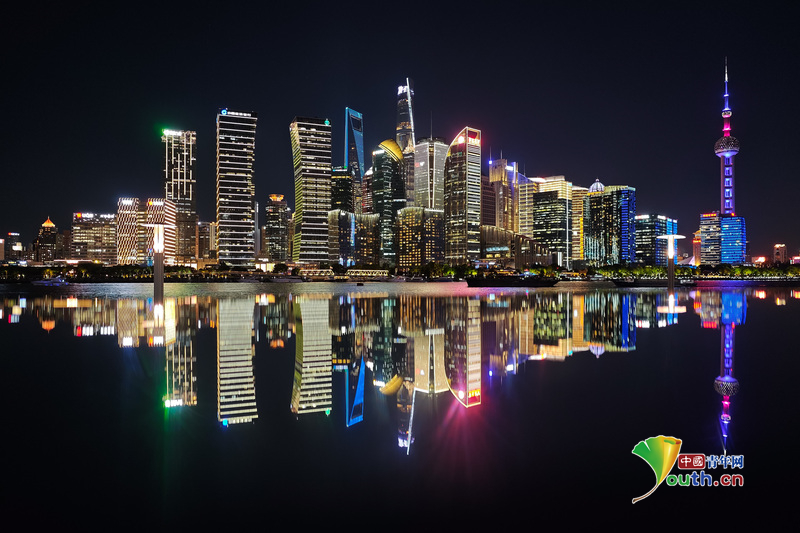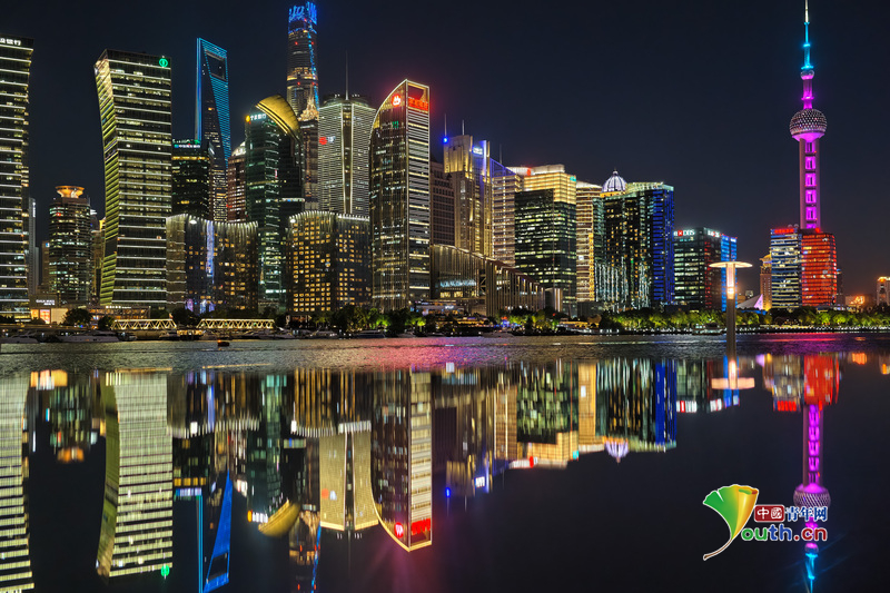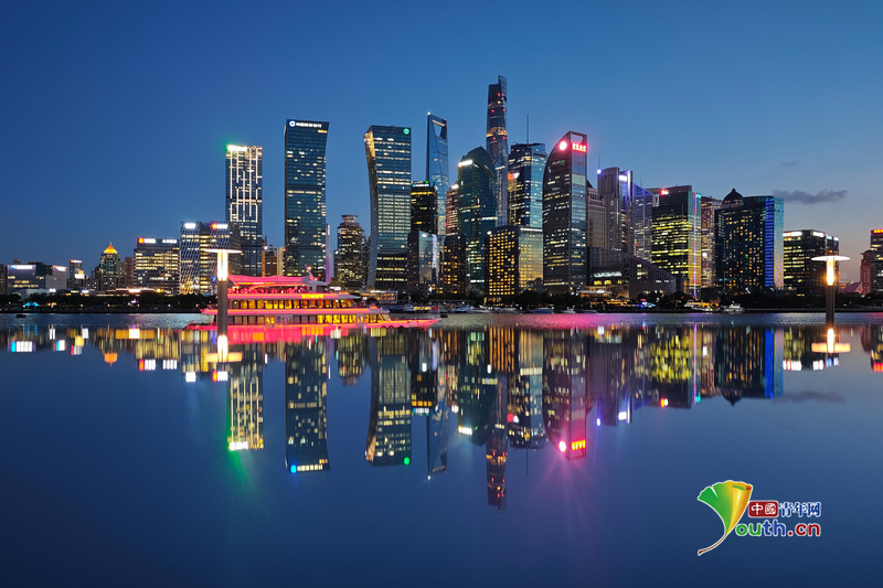 8月27日,當日入夜時分,在上海虹口區北外灘濱江眺望黃浦江對岸,陸家嘴摩天大樓夜色璀璨,流光溢彩美不勝收。