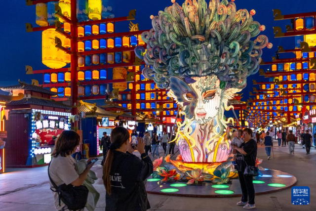 9月4日,在內蒙古烏蘭察布市“烏蘭察布之夜”特色街區,游客們在花燈前留影。