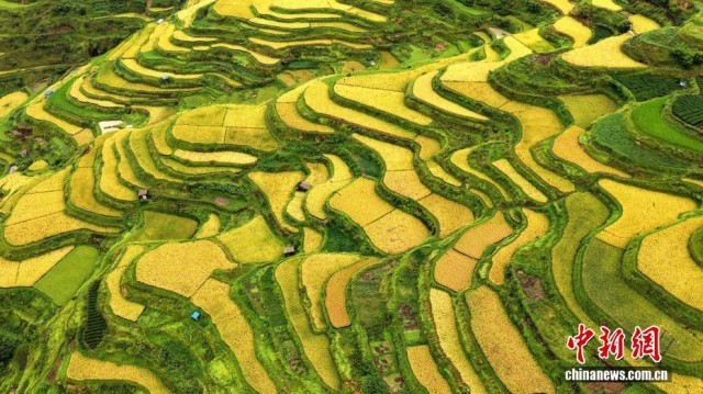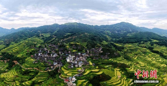9月8日,雨后的廣西三江侗族自治縣同樂苗族鄉桂書村、高武村,梯田如層層錦緞鋪展山野,特色民居點綴其間,繪就一幅靈秀靜謐的侗鄉田園畫卷。圖為廣西三江侗族自治縣同樂苗族鄉桂書村和高武村的梯田風光。