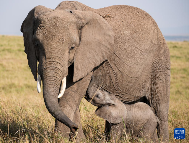 9月7日,在肯尼亞馬賽馬拉國家保護區,一頭小象在母象腹下尋乳。