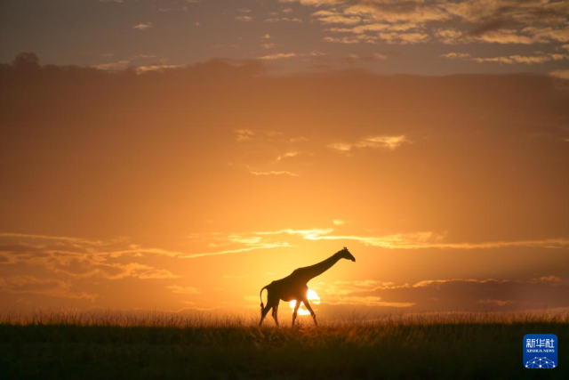 9月1日日出時分,在肯尼亞馬賽馬拉國家保護區,一只長頸鹿在草原上行走。