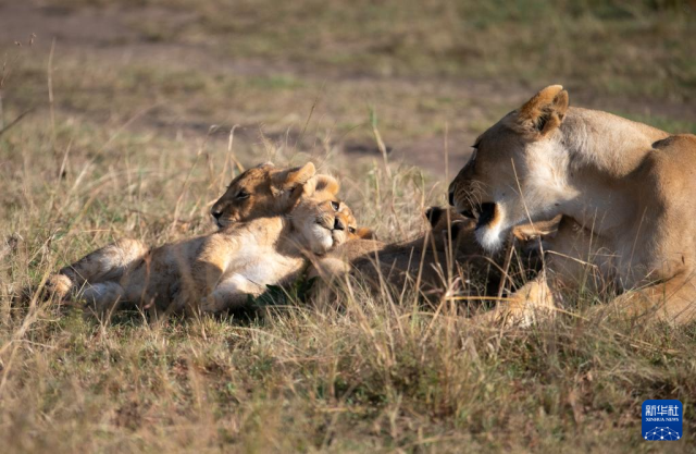 9月1日,在肯尼亞馬賽馬拉國家保護區,一頭母獅(右)帶著小獅子在草原上休息。