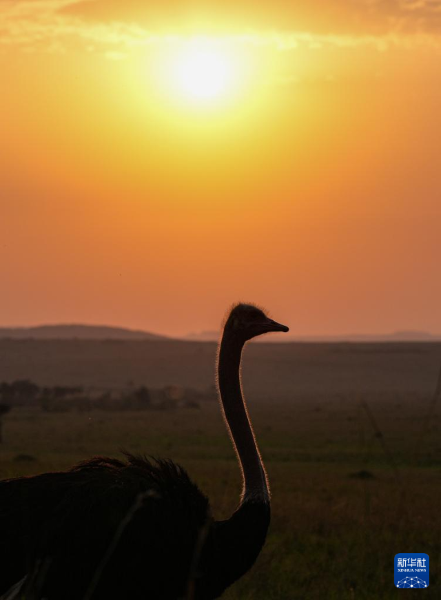 9月6日,在肯尼亞馬賽馬拉國家保護區,一只鴕鳥漫步在夕陽下。